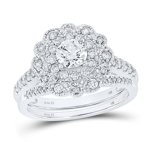At the heart of this stunning set lies a dazzling 1/2 carat center solitaire diamond. Its mesmerizing brilliance is further enhanced by a halo of 3/4 carat of shimmering round diamonds, creating a captivating display of elegance and romance. Each diamond is carefully selected for its exceptional quality, ensuring a radiant sparkle that will leave you breathless.