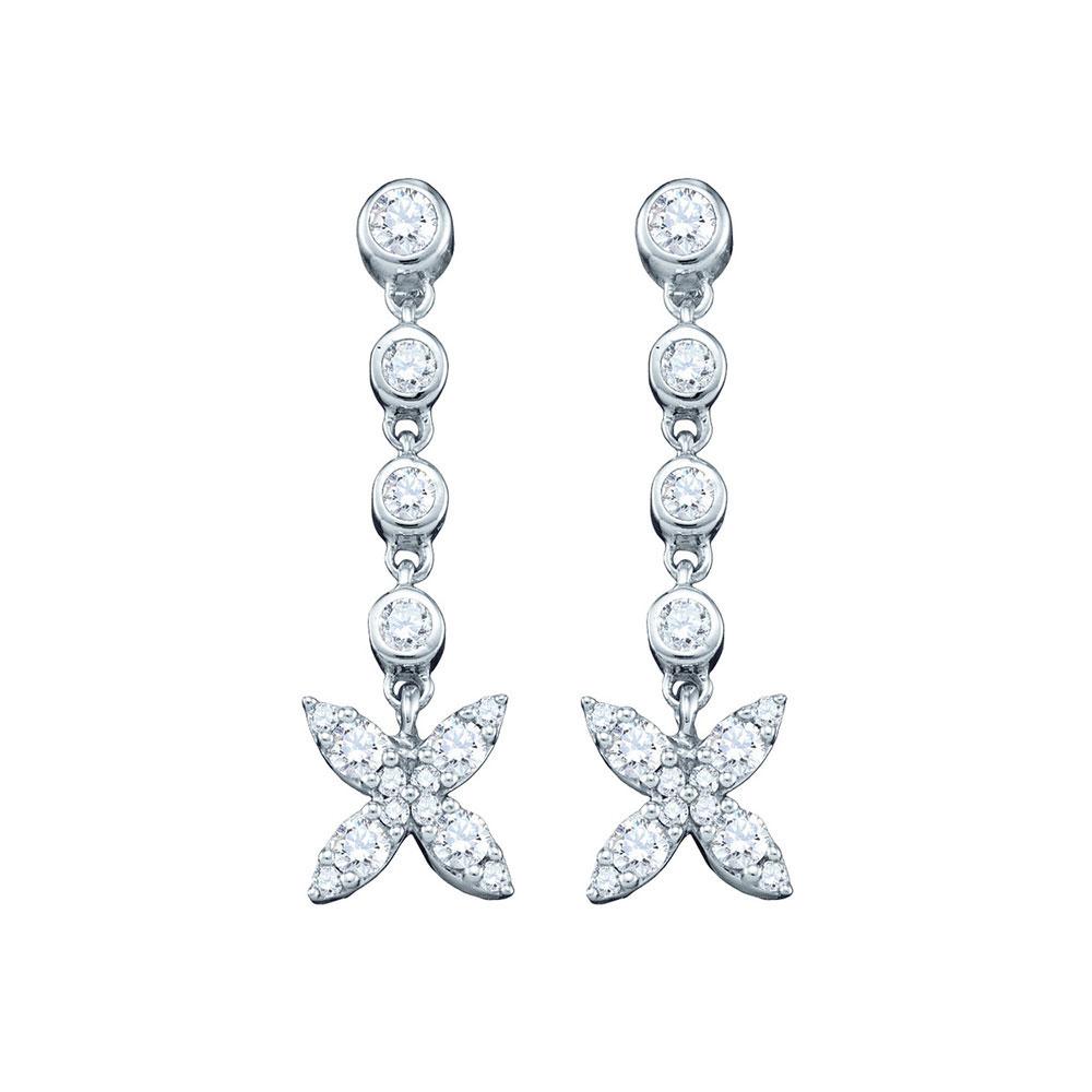Description 10kt White Gold Womens Round Diamond Flower Cluster Dangle Earrings 3/4 Cttw Gemstone Details 3/4 Carats total weight Specifications 10kt White Gold Combined diamond weight of 3/4 carats total weight represents a range of 0.71 - 0.82 cts. t.w.
