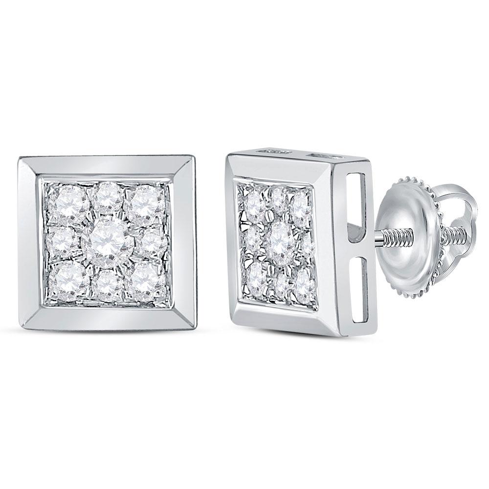 Description 14kt White Gold Womens Round Diamond Square Cluster Stud Earrings 1/2 Cttw Gemstone Details 1/2 Carats total weight Specifications 14kt White Gold Combined diamond weight of 1/2 carats total weight represents a range of 0.46 - 0.57 cts. t.w.
