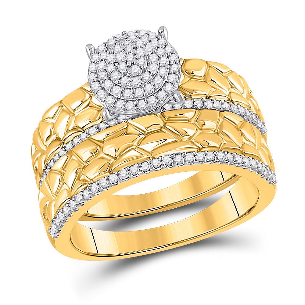 Get ready to say "I do" in style with our 10kt Yellow Gold His Hers Round Diamond Nugget Cluster Matching Wedding Set. This splendid jewelry collection is the perfect symbol of your everlasting love and commitment.