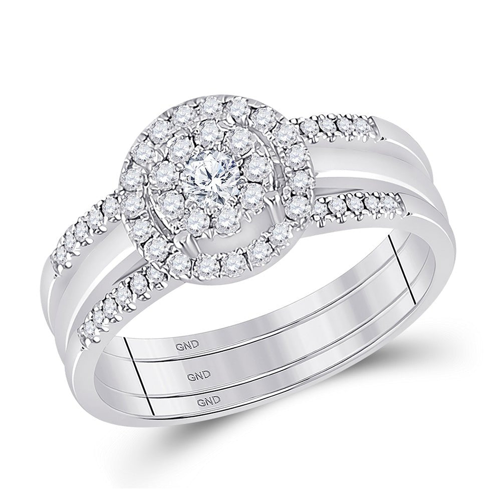 Introducing our exquisite 10kt White Gold Round Diamond 3-Piece Bridal Wedding Ring Band Set, a true symbol of everlasting love and commitment. This splendid jewellery collection is designed to make your special day even more memorable, adding a touch of elegance and sparkle to your bridal ensemble.