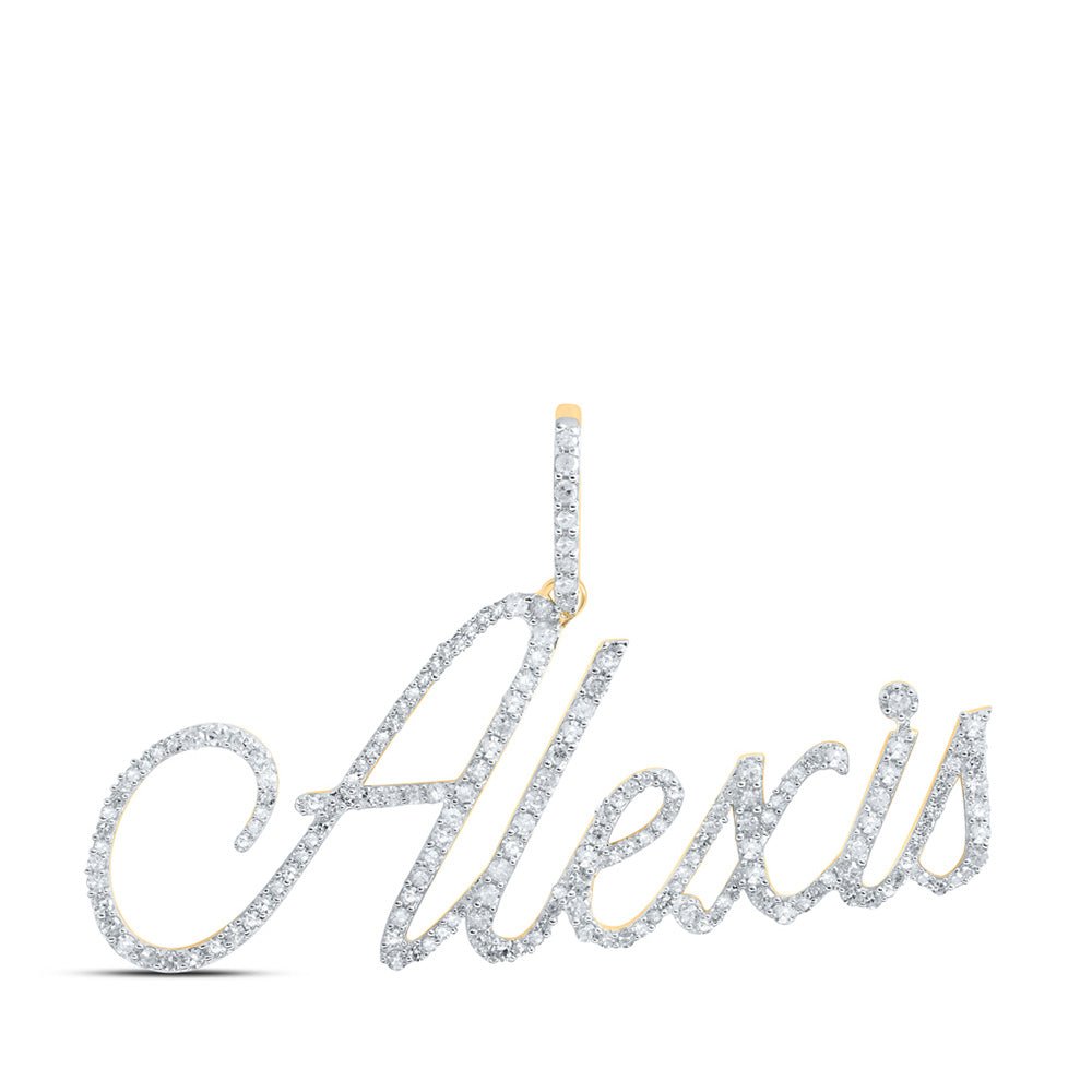 Indulge in the enchanting beauty of the 10kt Yellow Gold Womens Round Diamond ALEXIS Name Pendant. This exquisite piece of jewelry is a testament to the perfect blend of elegance and personalization.